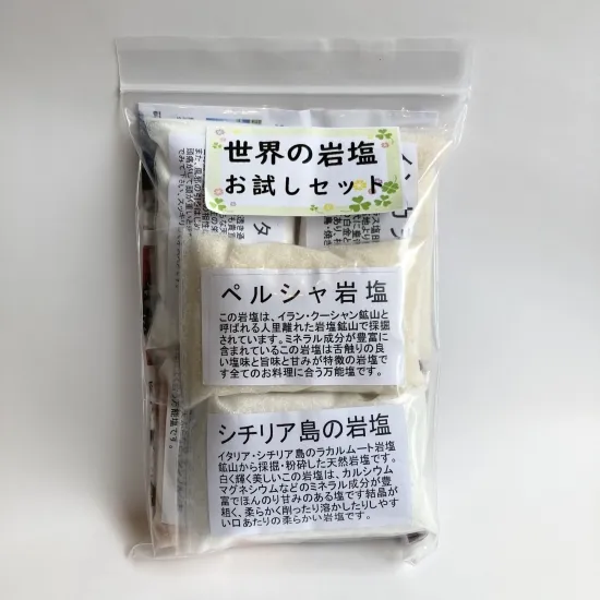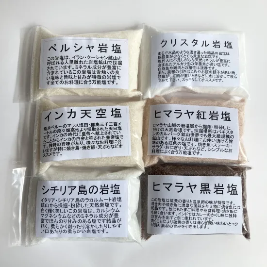 当店オススメの塩が6品目入ったお試しセットです。南米ペルーの天日塩、ヒマラヤ山脈の岩塩鉱山から掘削・採取された水晶のようなクリスタル岩塩、紅色の岩塩、硫黄成分を含んだ黒岩塩、イタリアはシチリア島産の岩塩、ペルシャ産のまろやかで甘みのある万能塩。天然岩塩ならではの個性と味わいをご堪能ください。
