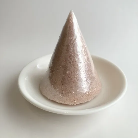 こちらはヒマラヤ岩塩ピンクソルトの粉塩を固めて作られています。外側のフィルムを剥がすと崩れる恐れがありますので、剥がさずそのままお使いください。